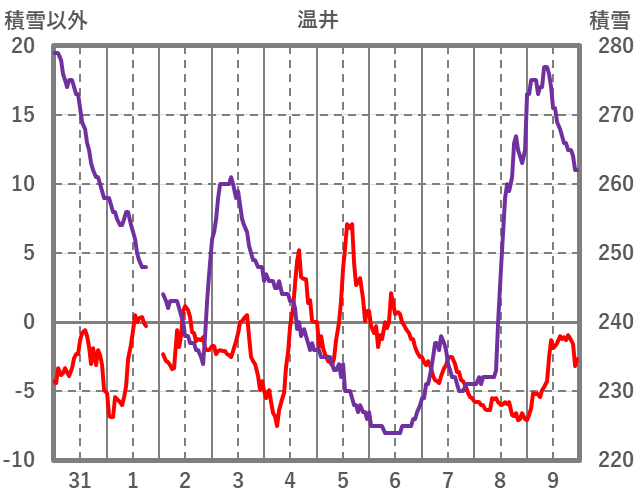 | 日 | 時 | 気温 | 降水 | 風向/風速 | 日照 | 積雪 | 降雪 |