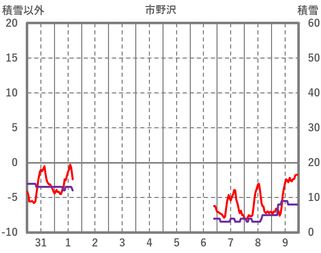 | 日 | 時 | 気温 | 降水 | 風向/風速 | 日照 | 積雪 | 降雪 |