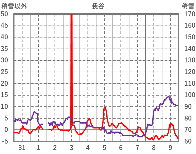 | 日 | 時 | 気温 | 降水 | 風向/風速 | 日照 | 積雪 | 降雪 |