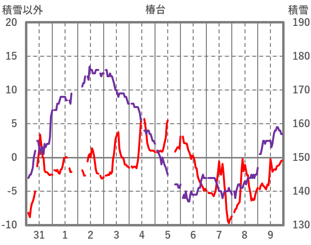 | 日 | 時 | 気温 | 降水 | 風向/風速 | 日照 | 積雪 | 降雪 |