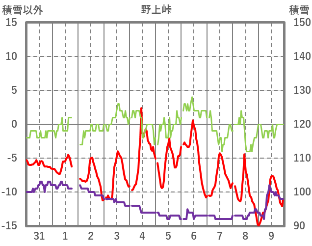 | 日 | 時 | 気温 | 降水 | 風向/風速 | 日照 | 積雪 | 降雪 |