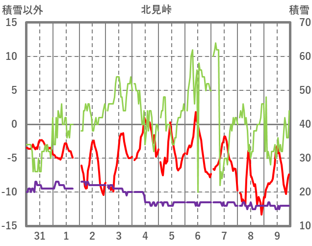 | 日 | 時 | 気温 | 降水 | 風向/風速 | 日照 | 積雪 | 降雪 |