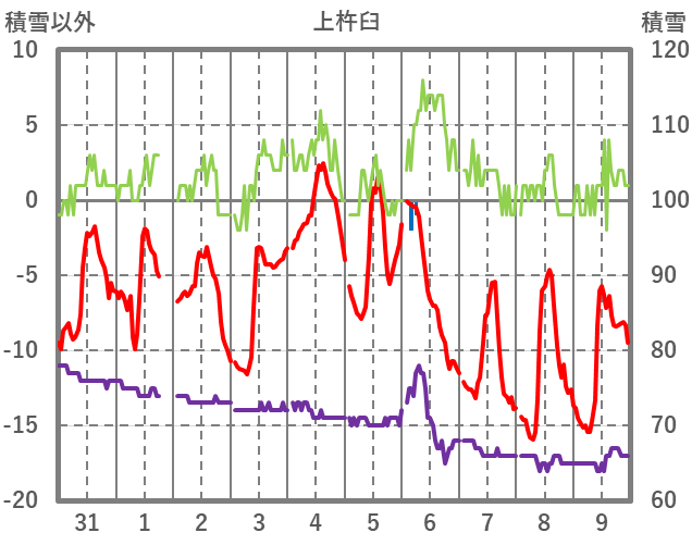 | 日 | 時 | 気温 | 降水 | 風向/風速 | 日照 | 積雪 | 降雪 |