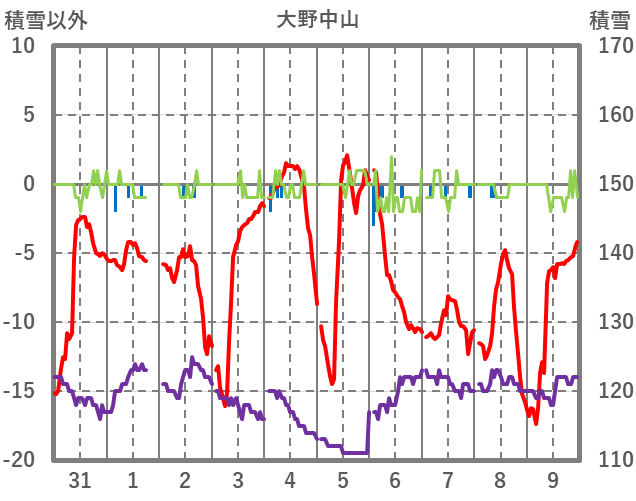 | 日 | 時 | 気温 | 降水 | 風向/風速 | 日照 | 積雪 | 降雪 |