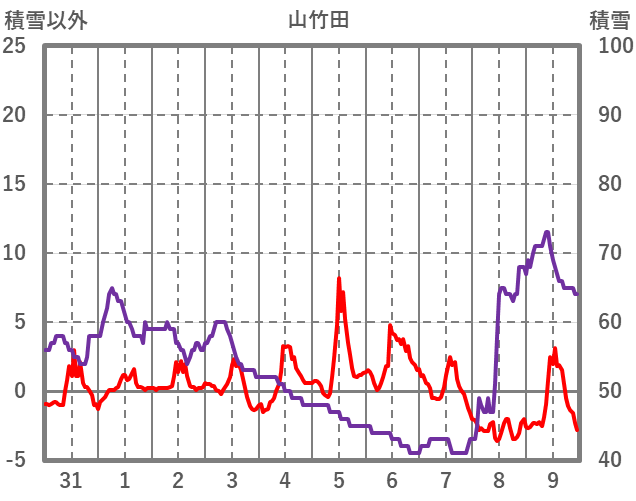 | 日 | 時 | 気温 | 降水 | 風向/風速 | 日照 | 積雪 | 降雪 |