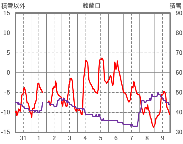 | 日 | 時 | 気温 | 降水 | 風向/風速 | 日照 | 積雪 | 降雪 |