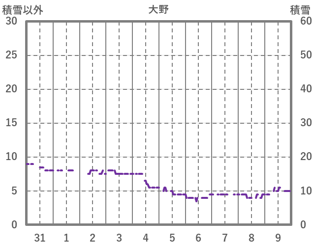 | 日 | 時 | 気温 | 降水 | 風向/風速 | 日照 | 積雪 | 降雪 |