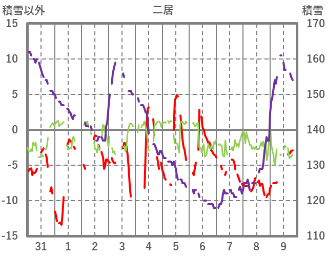 | 日 | 時 | 気温 | 降水 | 風向/風速 | 日照 | 積雪 | 降雪 |