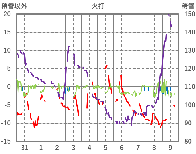 | 日 | 時 | 気温 | 降水 | 風向/風速 | 日照 | 積雪 | 降雪 |