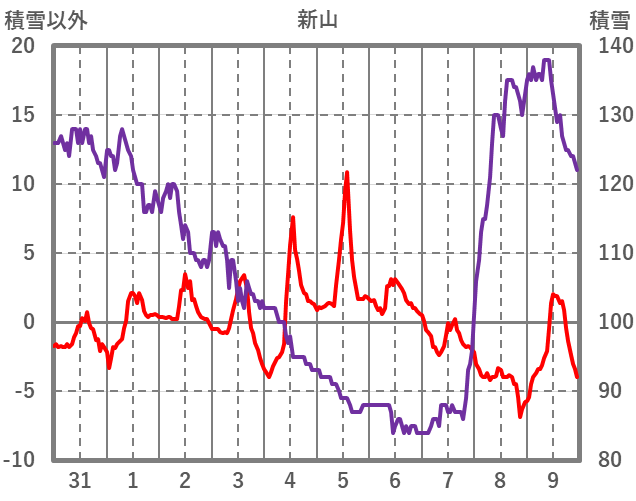 | 日 | 時 | 気温 | 降水 | 風向/風速 | 日照 | 積雪 | 降雪 |