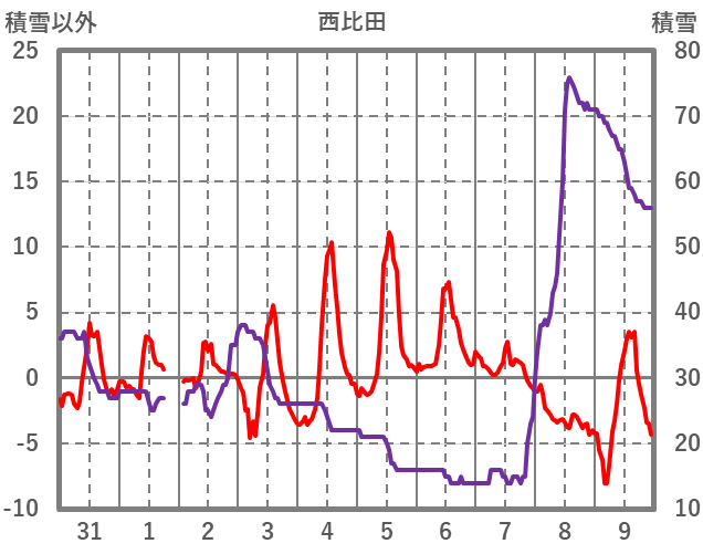 | 日 | 時 | 気温 | 降水 | 風向/風速 | 日照 | 積雪 | 降雪 |