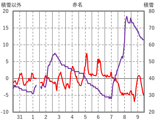 | 日 | 時 | 気温 | 降水 | 風向/風速 | 日照 | 積雪 | 降雪 |