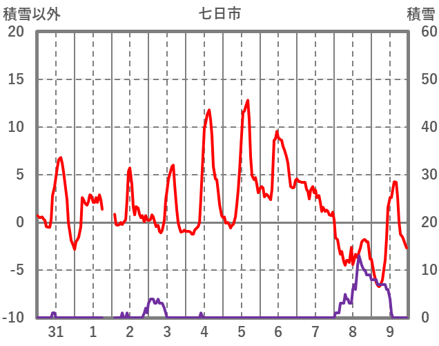 | 日 | 時 | 気温 | 降水 | 風向/風速 | 日照 | 積雪 | 降雪 |