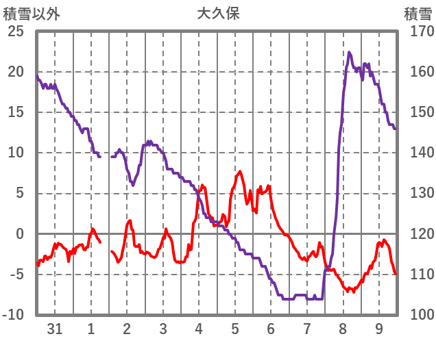 | 日 | 時 | 気温 | 降水 | 風向/風速 | 日照 | 積雪 | 降雪 |