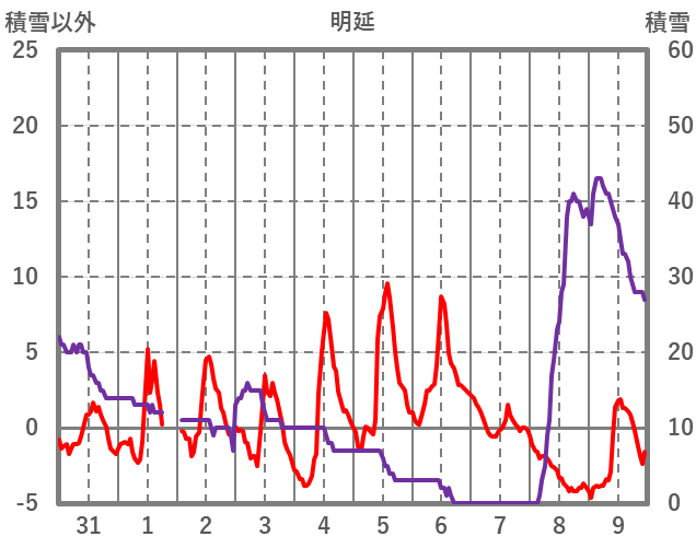| 日 | 時 | 気温 | 降水 | 風向/風速 | 日照 | 積雪 | 降雪 |