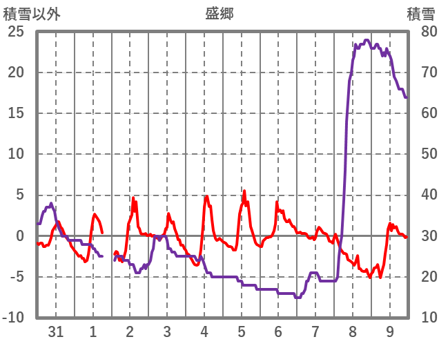 | 日 | 時 | 気温 | 降水 | 風向/風速 | 日照 | 積雪 | 降雪 |