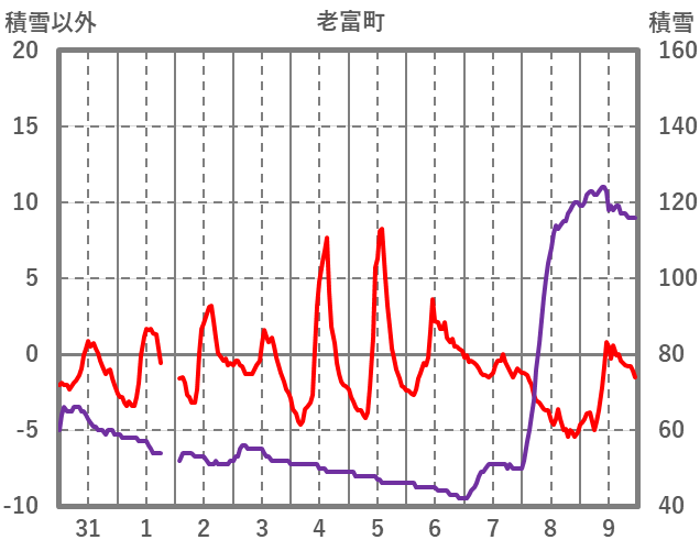 | 日 | 時 | 気温 | 降水 | 風向/風速 | 日照 | 積雪 | 降雪 |