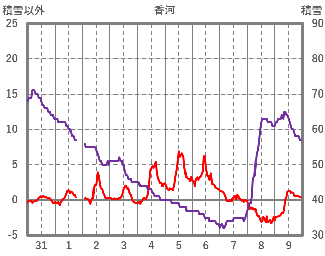 | 日 | 時 | 気温 | 降水 | 風向/風速 | 日照 | 積雪 | 降雪 |