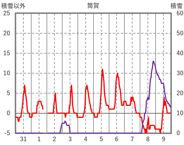 | 日 | 時 | 気温 | 降水 | 風向/風速 | 日照 | 積雪 | 降雪 |