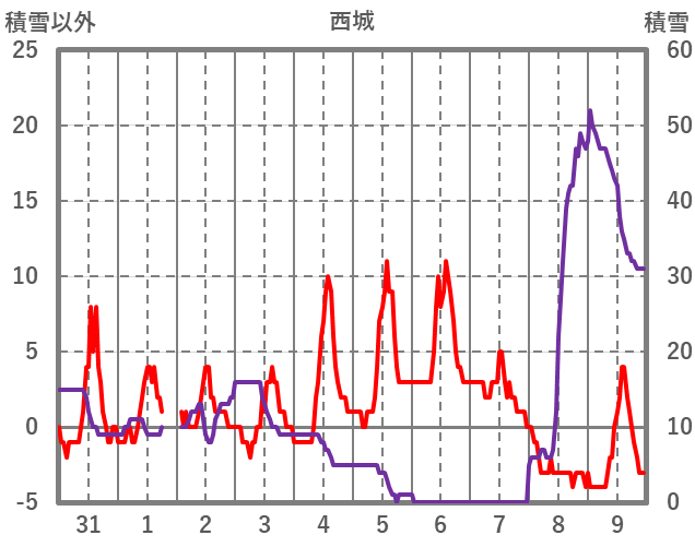 | 日 | 時 | 気温 | 降水 | 風向/風速 | 日照 | 積雪 | 降雪 |