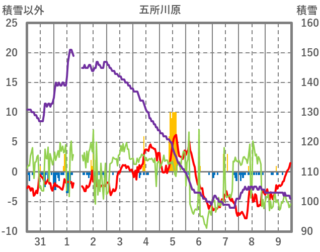 | 日 | 時 | 気温 | 降水 | 風向/風速 | 日照 | 積雪 | 降雪 |