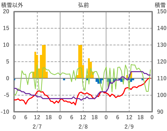 | 日 | 時 | 気温 | 降水 | 風向/風速 | 日照 | 積雪 | 降雪 |