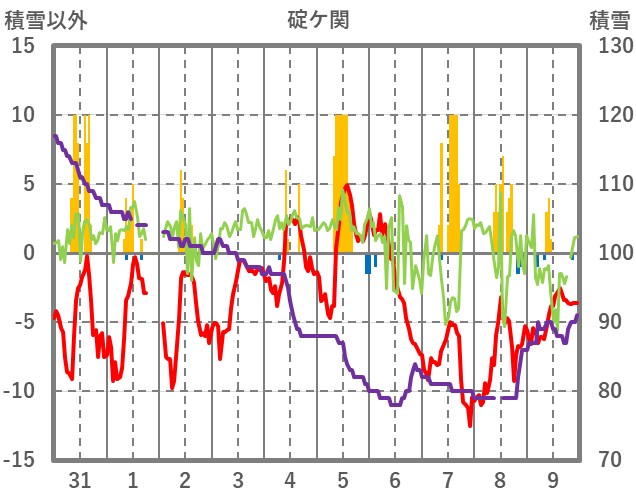 | 日 | 時 | 気温 | 降水 | 風向/風速 | 日照 | 積雪 | 降雪 |
