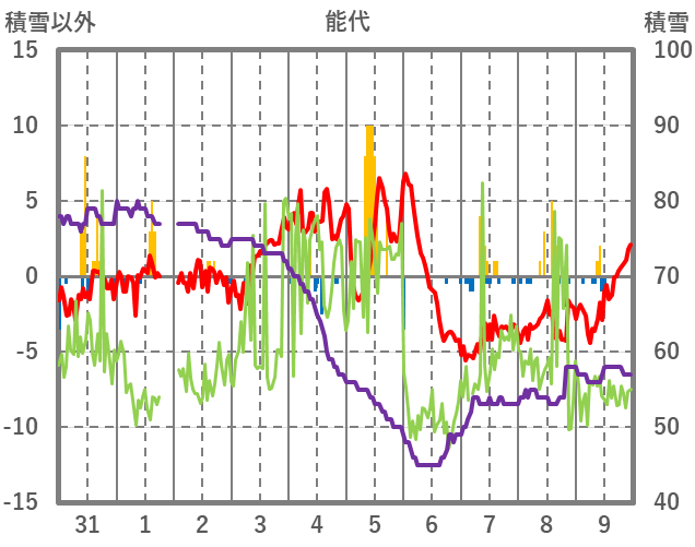 | 日 | 時 | 気温 | 降水 | 風向/風速 | 日照 | 積雪 | 降雪 |