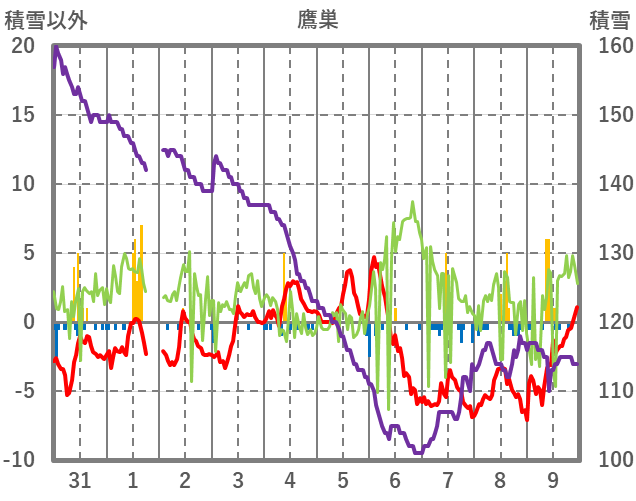 | 日 | 時 | 気温 | 降水 | 風向/風速 | 日照 | 積雪 | 降雪 |