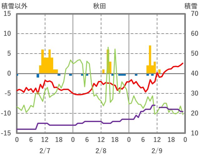 | 日 | 時 | 気温 | 降水 | 風向/風速 | 日照 | 積雪 | 降雪 |