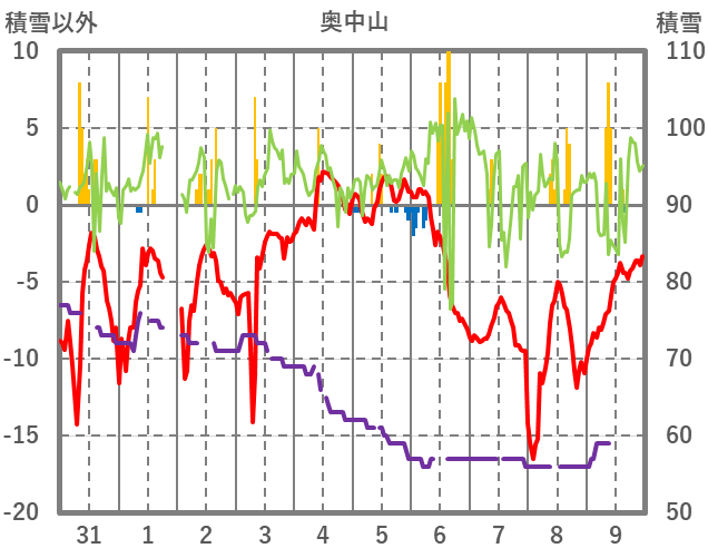 | 日 | 時 | 気温 | 降水 | 風向/風速 | 日照 | 積雪 | 降雪 |