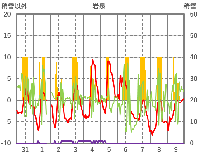 | 日 | 時 | 気温 | 降水 | 風向/風速 | 日照 | 積雪 | 降雪 |