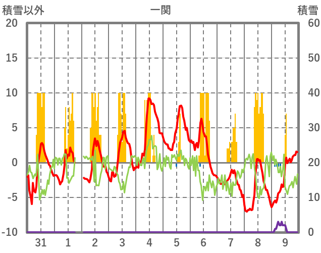 | 日 | 時 | 気温 | 降水 | 風向/風速 | 日照 | 積雪 | 降雪 |