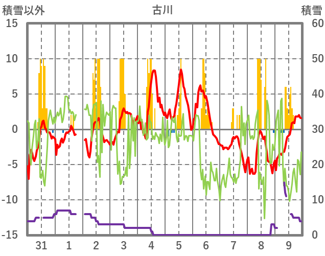 | 日 | 時 | 気温 | 降水 | 風向/風速 | 日照 | 積雪 | 降雪 |