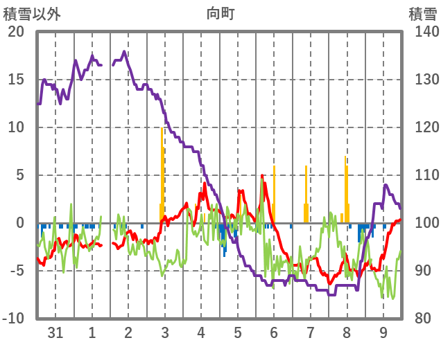 | 日 | 時 | 気温 | 降水 | 風向/風速 | 日照 | 積雪 | 降雪 |