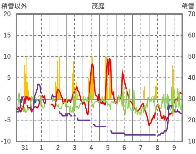 | 日 | 時 | 気温 | 降水 | 風向/風速 | 日照 | 積雪 | 降雪 |