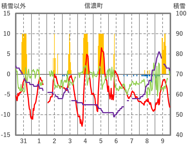 | 日 | 時 | 気温 | 降水 | 風向/風速 | 日照 | 積雪 | 降雪 |