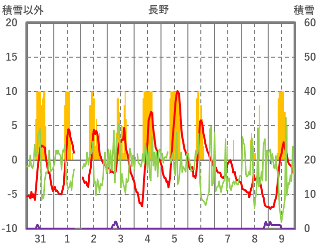 | 日 | 時 | 気温 | 降水 | 風向/風速 | 日照 | 積雪 | 降雪 |