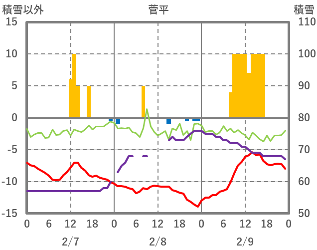 | 日 | 時 | 気温 | 降水 | 風向/風速 | 日照 | 積雪 | 降雪 |