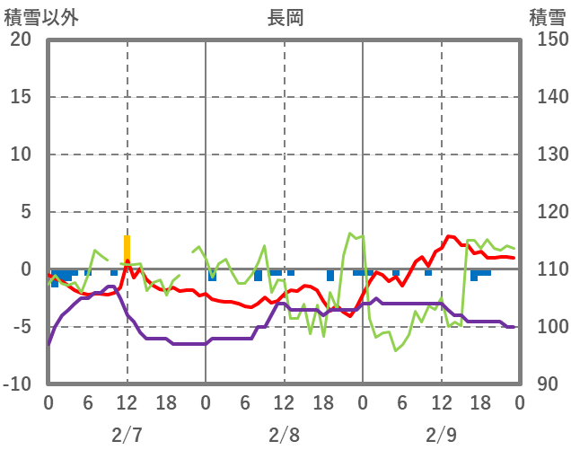 | 日 | 時 | 気温 | 降水 | 風向/風速 | 日照 | 積雪 | 降雪 |