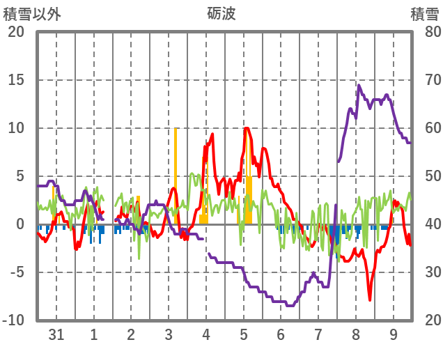 | 日 | 時 | 気温 | 降水 | 風向/風速 | 日照 | 積雪 | 降雪 |