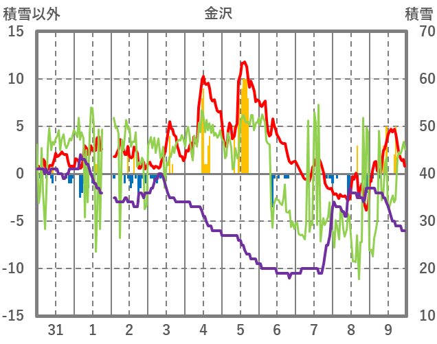 | 日 | 時 | 気温 | 降水 | 風向/風速 | 日照 | 積雪 | 降雪 |