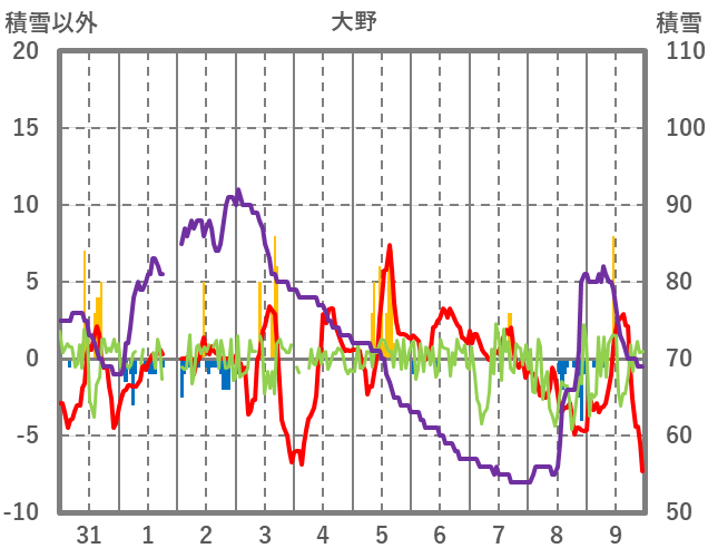 | 日 | 時 | 気温 | 降水 | 風向/風速 | 日照 | 積雪 | 降雪 |