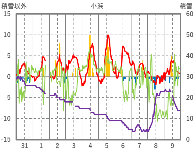| 日 | 時 | 気温 | 降水 | 風向/風速 | 日照 | 積雪 | 降雪 |
