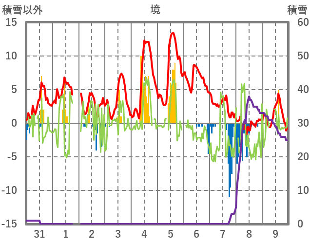 | 日 | 時 | 気温 | 降水 | 風向/風速 | 日照 | 積雪 | 降雪 |