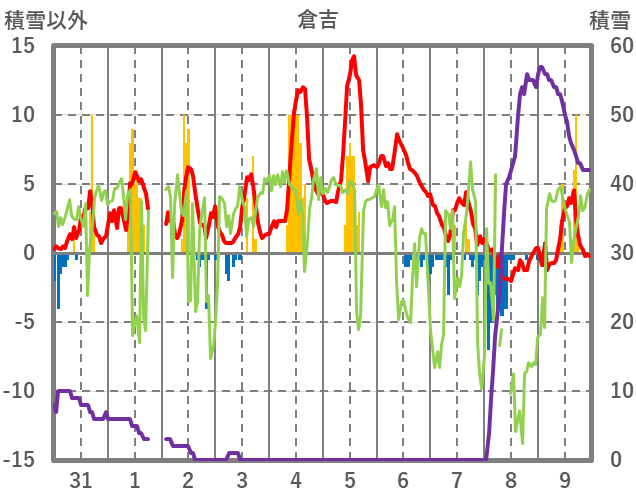 | 日 | 時 | 気温 | 降水 | 風向/風速 | 日照 | 積雪 | 降雪 |