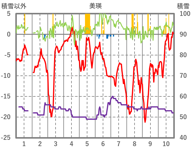 | 日 | 時 | 気温 | 降水 | 風向/風速 | 日照 | 積雪 | 降雪 |