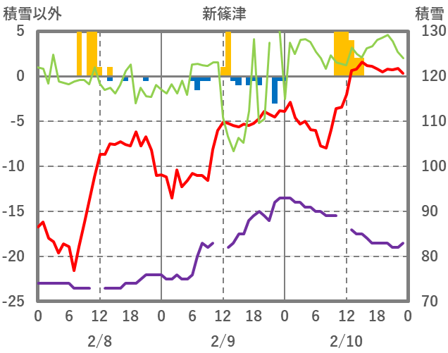 | 日 | 時 | 気温 | 降水 | 風向/風速 | 日照 | 積雪 | 降雪 |