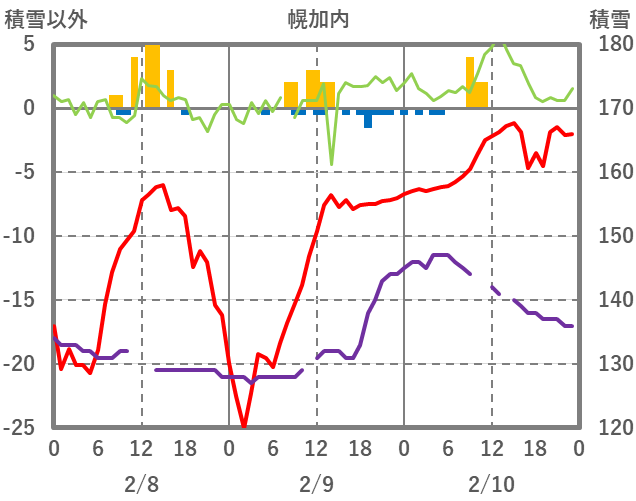 | 日 | 時 | 気温 | 降水 | 風向/風速 | 日照 | 積雪 | 降雪 |
