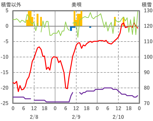 | 日 | 時 | 気温 | 降水 | 風向/風速 | 日照 | 積雪 | 降雪 |